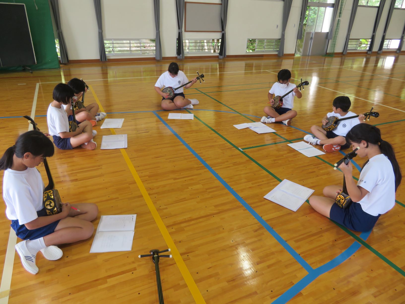 三線6/9(JPG:348KB) (ふるさと学習として全校児童で三線の練習をしています。)