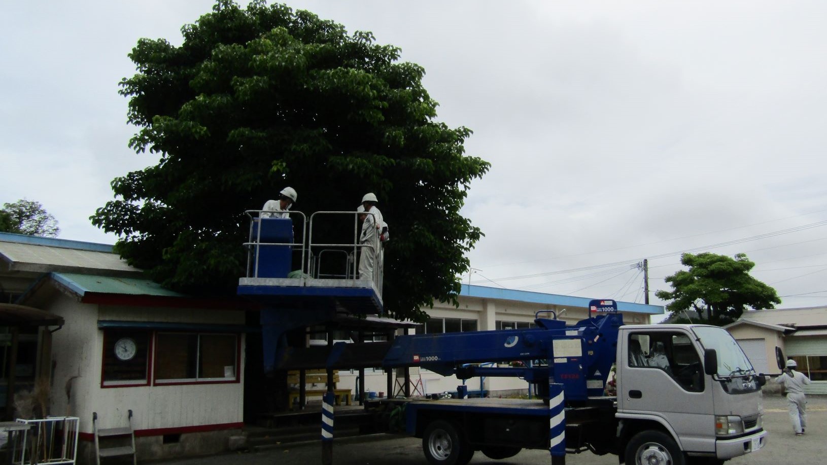 校庭樹木伐採作業①7/2(JPG:255KB) (竹山建設さんが校庭のアカギの枝の伐採をしてくださいました。とてもすっきりとなりました。ありがとうございます)