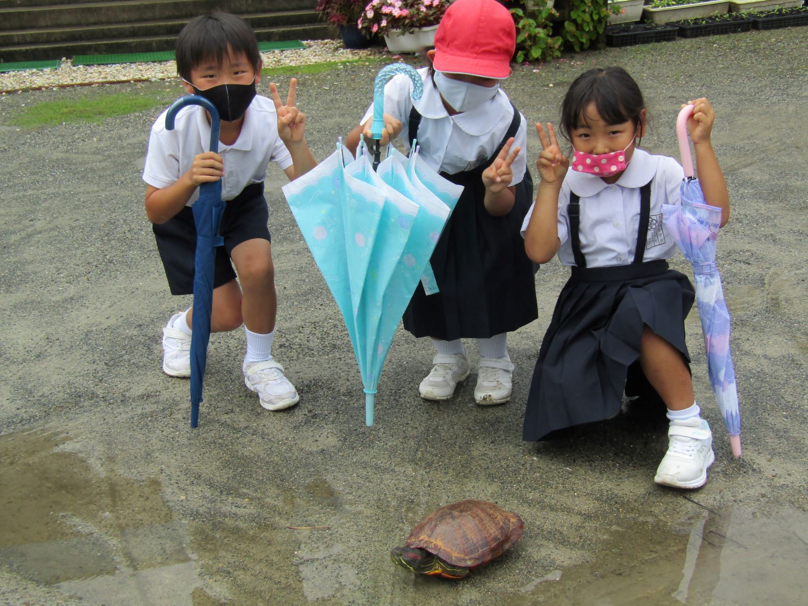 ミドリガメ③6/16(JPG:297KB) (校庭を散歩するミミちゃんを見守ってます。)